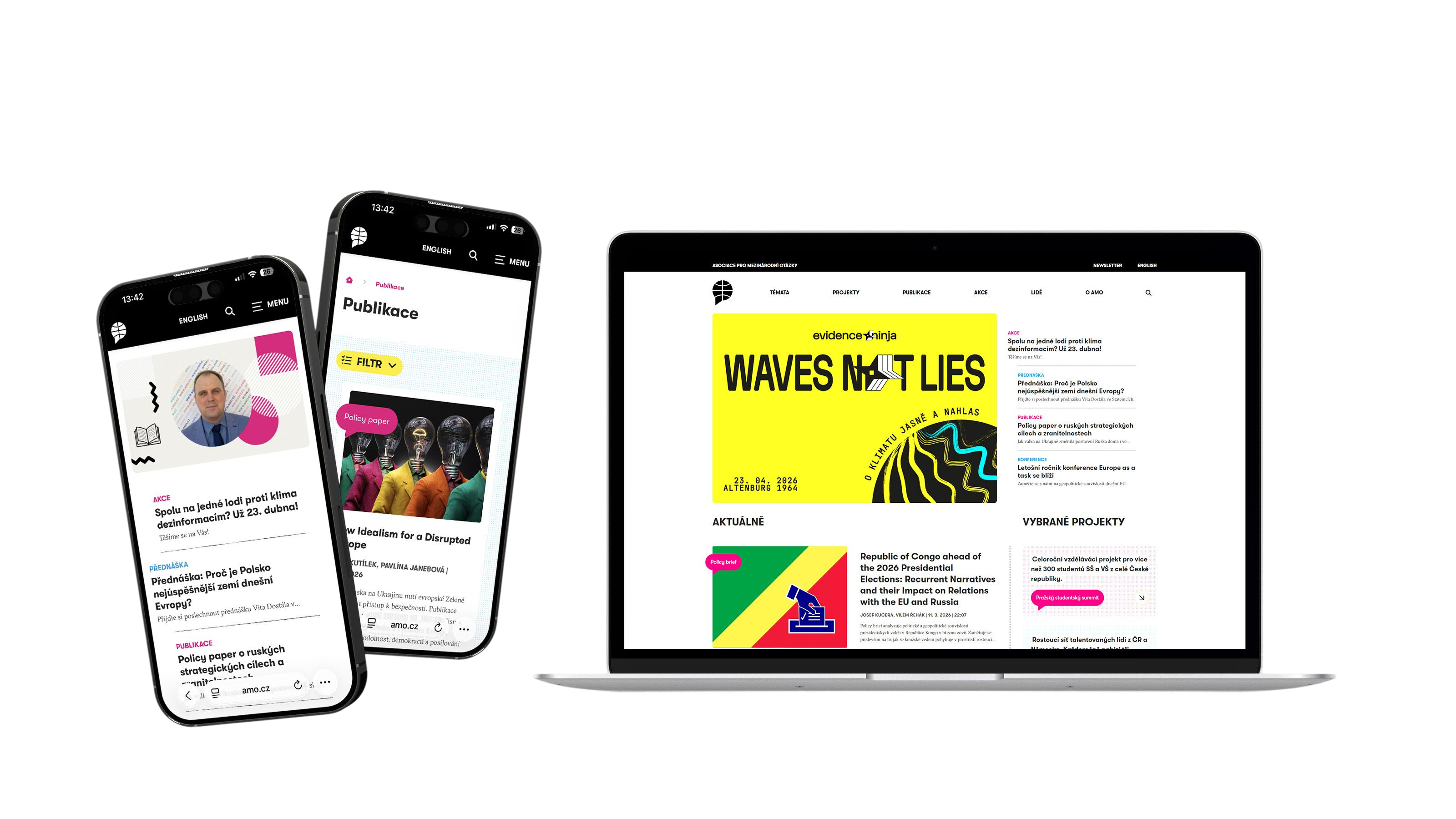 Vizuální identita webu musela působit seriózně, ale moderně. AMO je instituce, která udává trendy v odborné diskuzi, a tomu odpovídá i grafika.